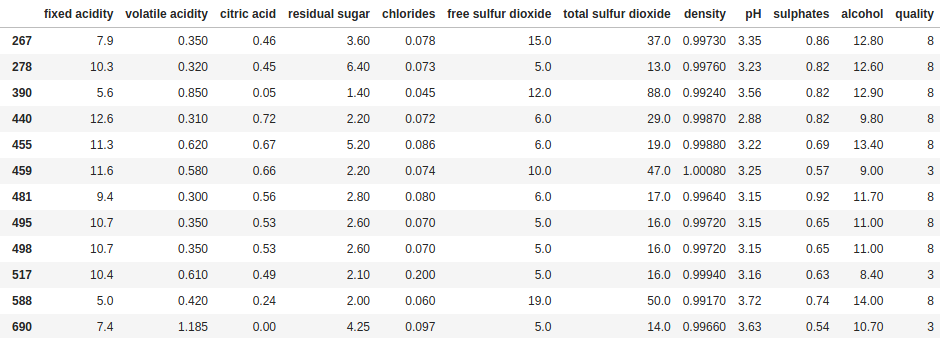 These basic comparisons work in two different ways. The first is the simple one: comparing the values in a DataFrame column to a single value (df["fixed acidity"] > 12
