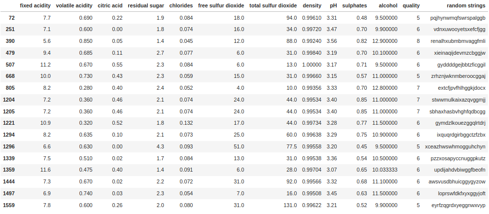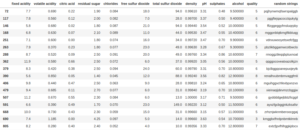 String comparisons sometimes end up being the most complex that we have to make. Having some basic tools to work with can help to navigate that complexity. But first, let’s create a column with some string data to work with. The following code will create a new column in our DataFrame called random strings