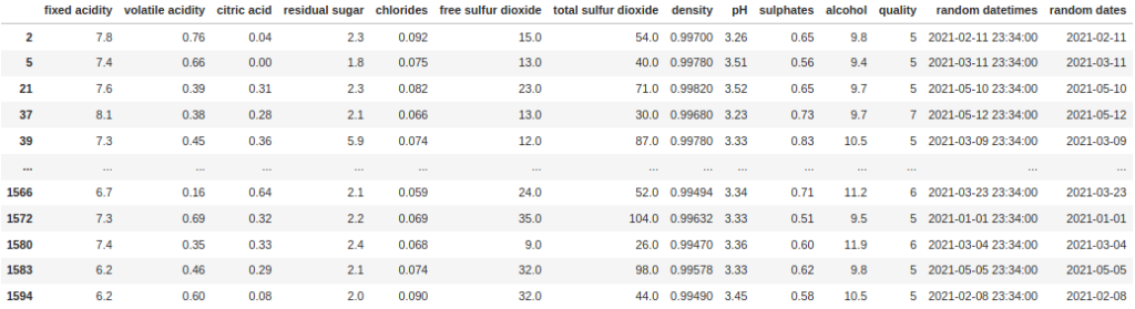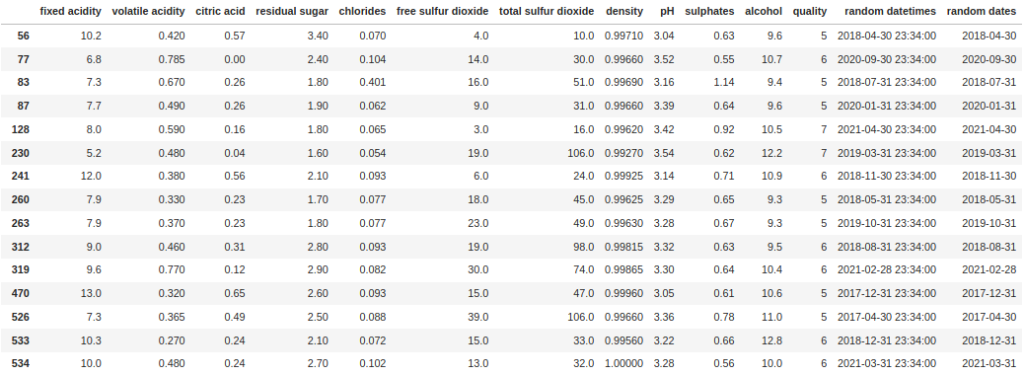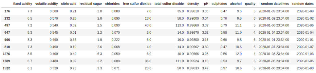 Again to get started, let’s create columns with dates and timestamp data to work with. The following code will create two new columns in the DataFrame called random dates