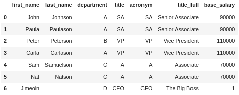 If you don’t have a dataset you want to play around with, University of California Irvine has an excellent online repository of datasets that you can play with. For this explainer we are going to be using some fictional data about a company. If you want to follow along, you can create the DataFrames using the code below. If you want to better understand how this code makes DataFrames, I recommend reading our importing JSON data guide: